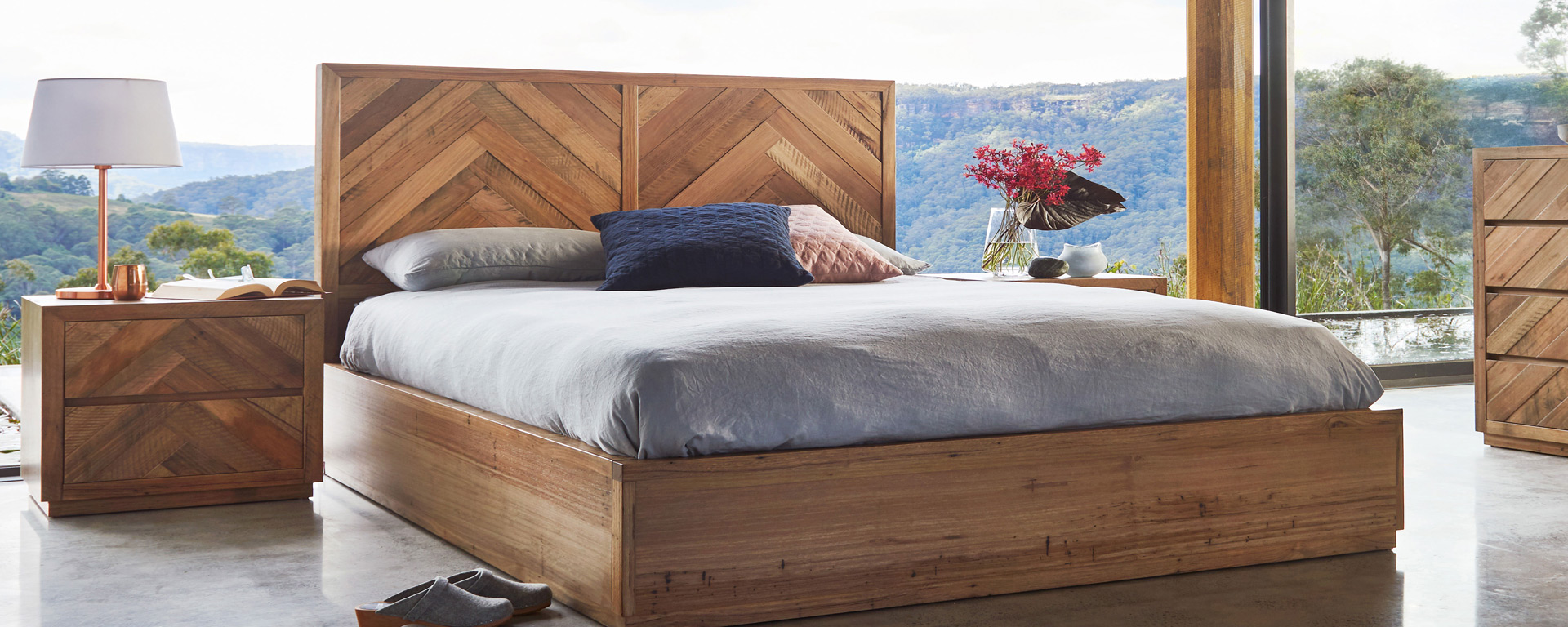 Your master bedroom should make a statement of your personal style and be a welcoming haven you can truly unwind in at the end of a long day. To achieve this, you will need a showpiece bed frame that is both soothing to the eye and versatile. Consider the customisable, Australian made ‘Herringbone’ Queen Bed. Contemporary design and the beauty of natural materials combine in this bed to create a masterpiece worthy of the master bedroom. A large bedhead steals the show with its beautiful parquetry display in contrasting timber tones. You can choose from a selection of Silvertop Ash timber stain colours (pictured here in our newest hue, ‘Cameo’), and you can even customise your bed to have storage drawers in the side or at the foot end to suit your needs. Add the ‘Herringbone’ Tallboy, Dresser and Bedside Tables with a matching pattern to complete the look.