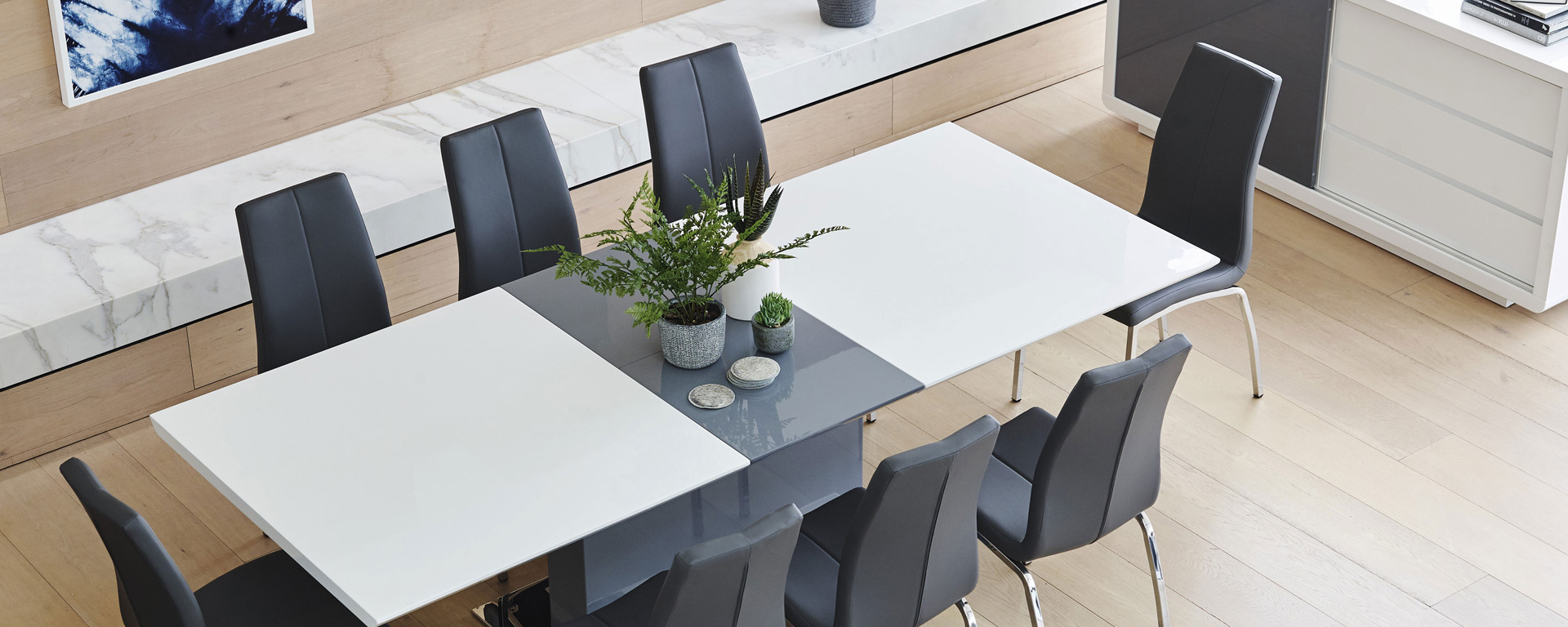 Equally suited to a sit-down dinner or wine and canapés with the ability to extend from 190cm to 240cm to offer extra space for those unexpected holiday plus-ones, the Dallas 9-Piece Rectangular Extension Dining Suite introduces the best contemporary design to your dining room furniture. Embrace high-gloss glamour with a monochrome palette, mirrored finish dining table, and sleek PU dining chairs available in Black, White or Grey – find the perfect fit for your interior design.