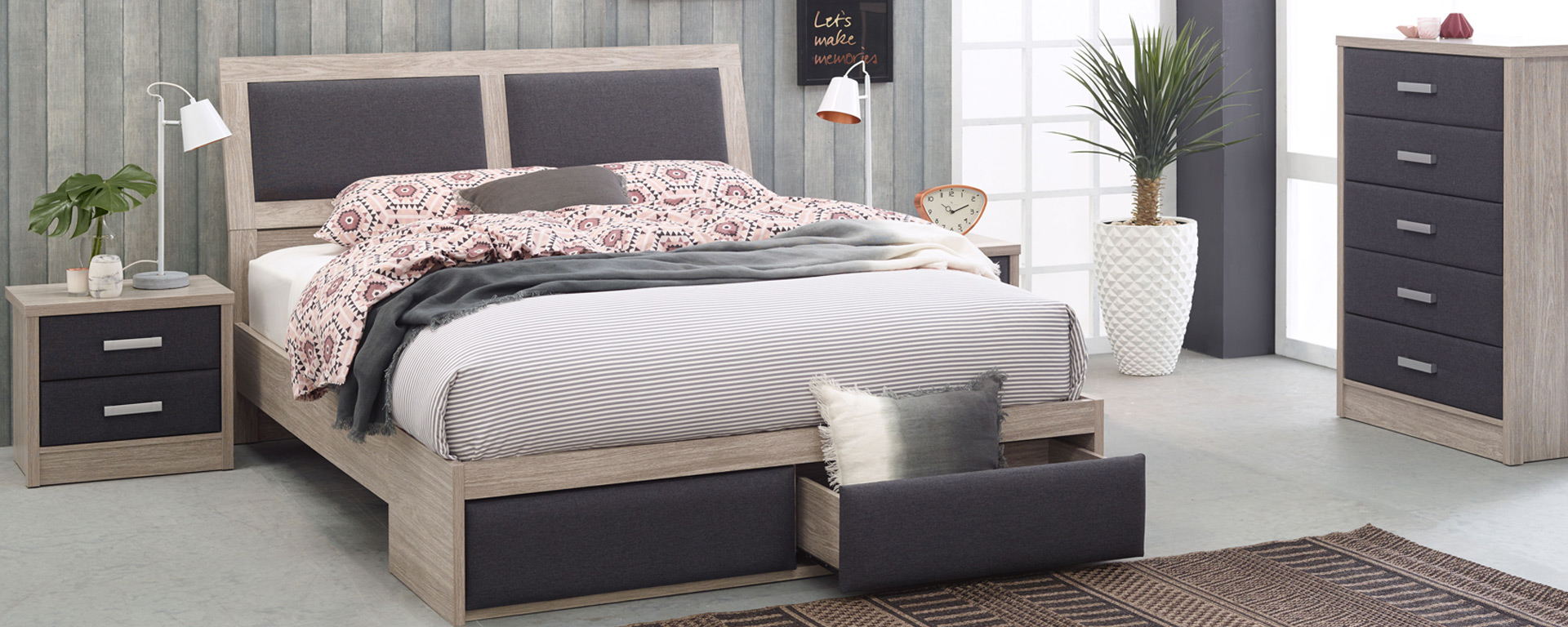 Sending out a refined and relaxed vibe with its eye-catching, two-toned style, the exclusive ‘Beacon’ bed with storage drawers successfully unites form and function within the bedroom. Simple and sleek, the upholstered bedhead and foot end provide a stunning contrast to the timber frame while the handy drawers in the foot end provide the perfect place to neatly store pillows, sheets and blankets.