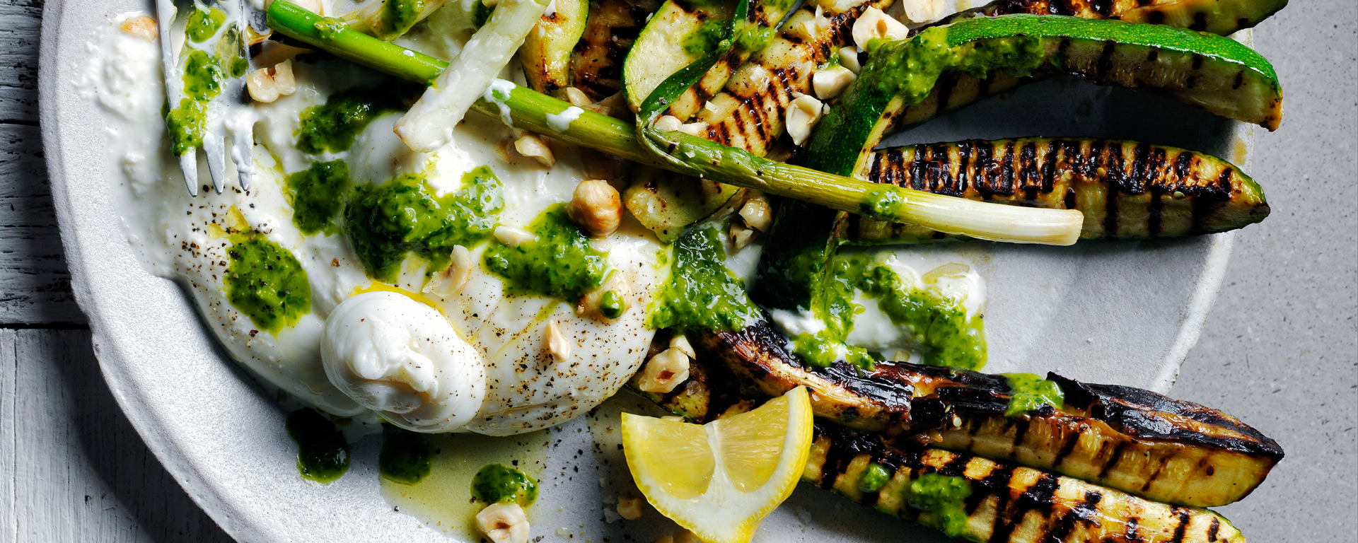 4. Arrange zucchini and onion around burrata and drizzle with salsa verde. Sprinkle with some hazelnuts; season the burrata and drizzle a bit of olive oil. Serve with lemon wedges.