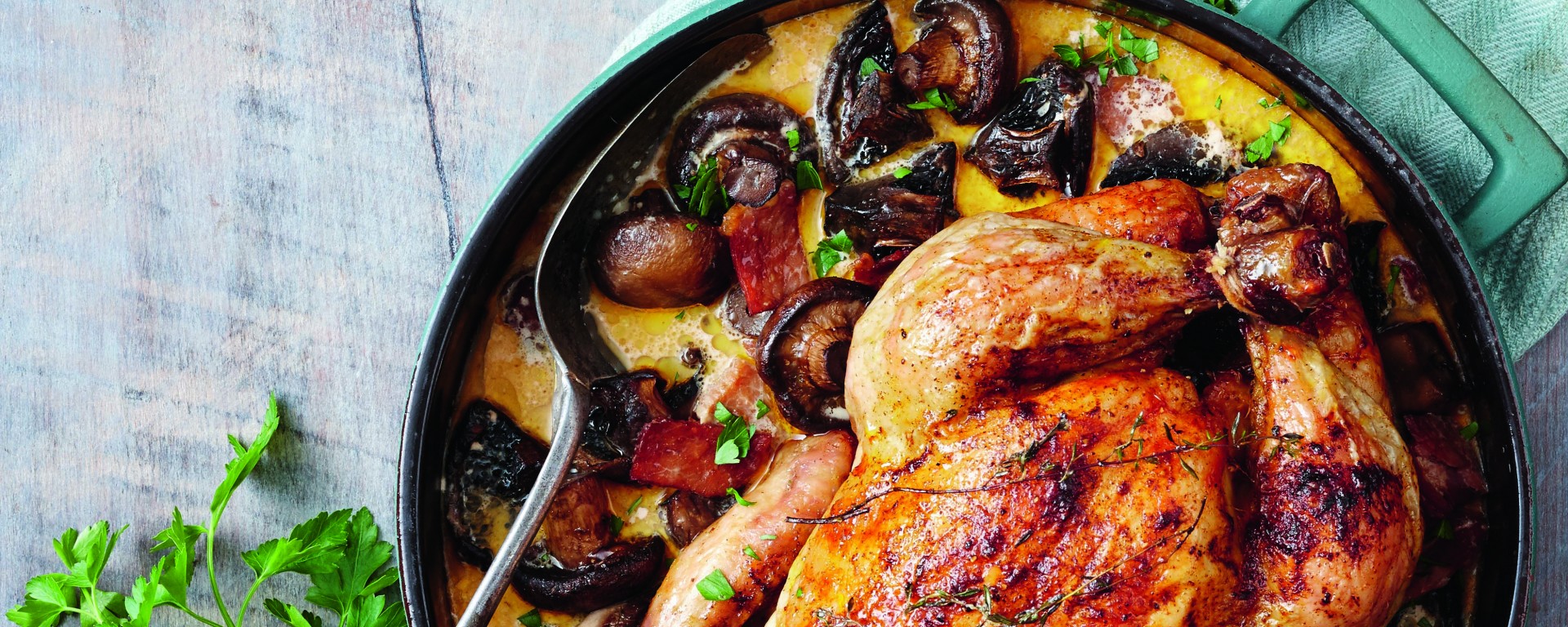 3 Baste chicken with any pan juices. Add speck, stock, wine and half the mushrooms to roasting pan. Season with salt and pepper. Roast for a further 1 hour, basting with pan juices.