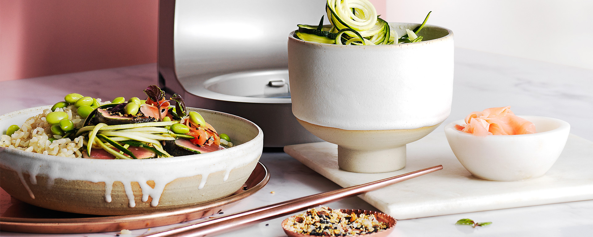 To assemble: Slice tuna into 1cm slices. Arrange rice, zucchini, edamame in bowls. Top with tuna, avocado and pickled ginger. Drizzle with remaining dressing and sprinkle with purple shiso leaves and spicy Japanese seasoning.