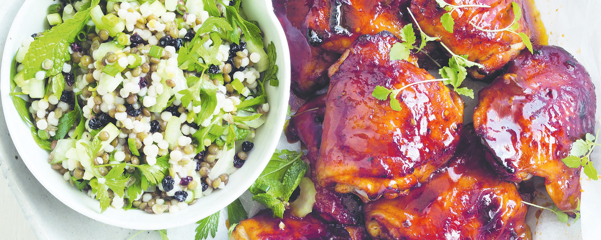 5 Meanwhile, make Lentil Herb Salad: Cook couscous following packet directions. Drain. Rinse under cold water. Drain well. Transfer to a large bowl. Add lentils, cucumber and currants. Toss to combine. Whisk vinegar and oil together in a small jug. Season with salt and pepper. Drizzle dressing over salad. Add parsley, coriander and chives. Toss gently to combine.