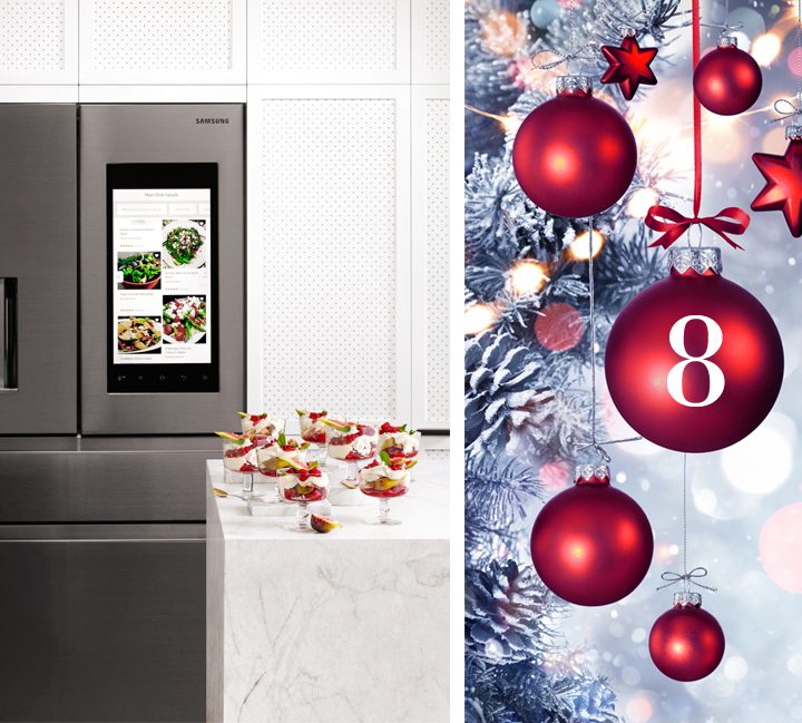 In the above image, ingredients for Adam Wolfer’s roasted purple cauliflower with harissa, macadamia and pickled currants recipe are being stored in the Samsung Family Hub 634L Flat Door French-Door Fridge – available from Harvey Norman.