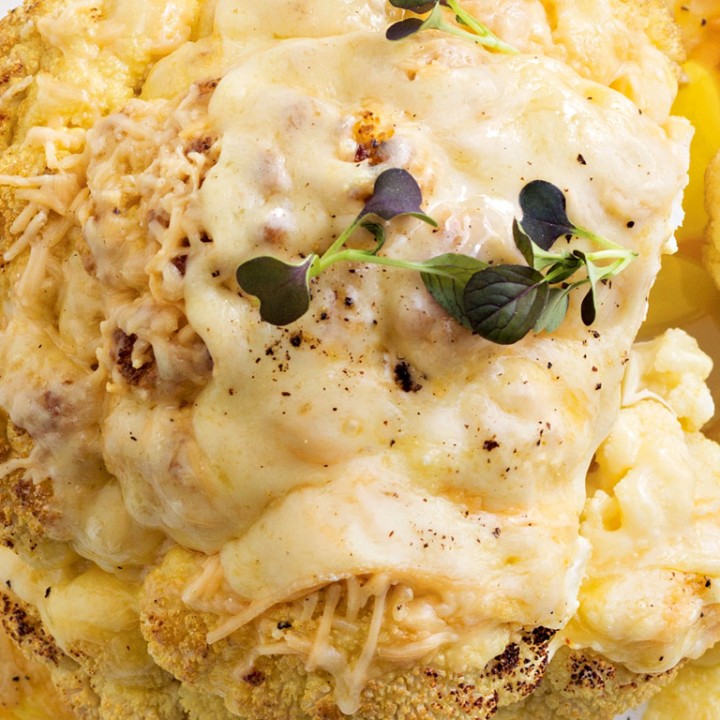 9) To serve, cut cauliflower in half through stalk, then brush the cut-side with harissa paste. Sprinkle with some macadamia and cauliflower crunch and pickled currants, then dust with harissa spice and serve drizzled with dressing and lemon wedges.