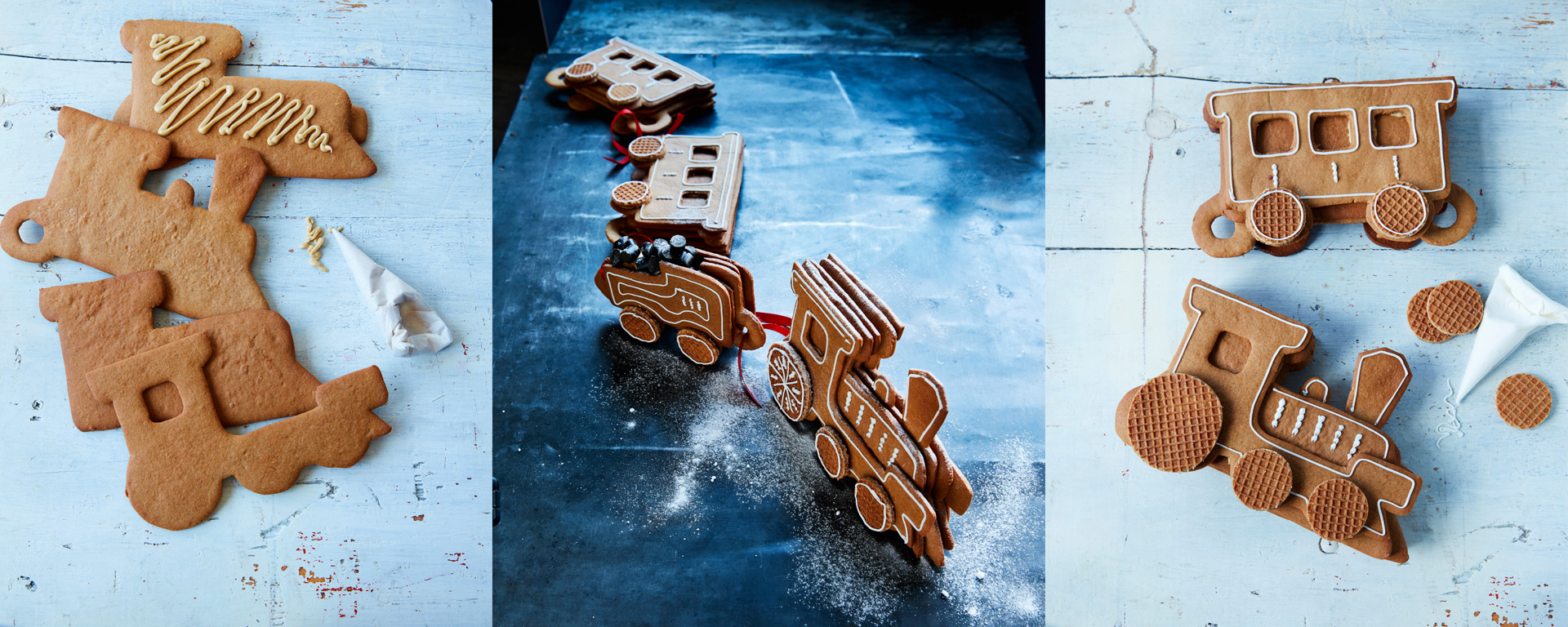 STEP 1 For the gingerbread train, multiply the gingerbread women recipe by 3 (but make in batches). Working in batches, roll pieces out onto a well floured surface until 3mm thick. Transfer to baking trays lined with baking paper and freeze for 10 minutes or until firm.