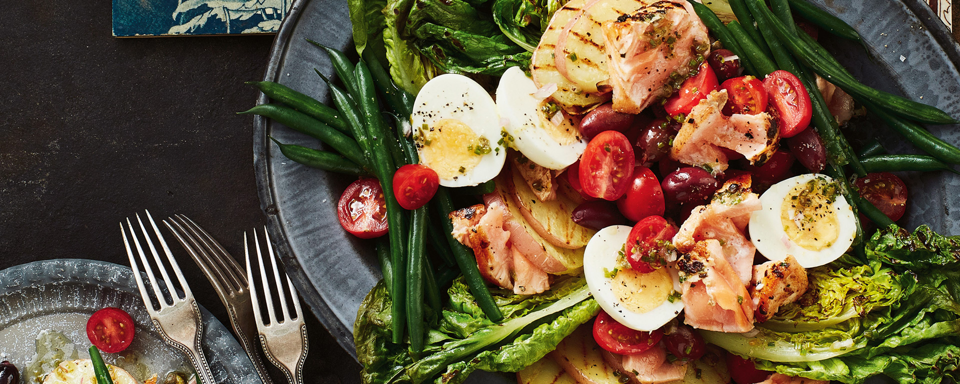 5 Arrange grilled vegetables, salmon, egg, olives and tomato on a serving platter. Drizzle with dressing. Serve.