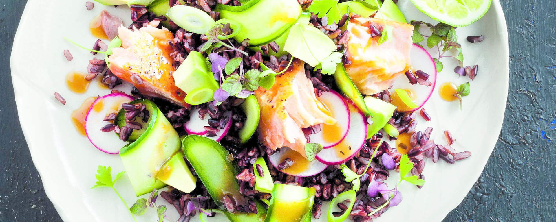 6 Whisk reserved sauce mixture with sesame oil and lime juice. Drain cucumber. Arrange rice, cucumber, radish, trout, avocado and onion on serving plates. Drizzle with dressing and sprinkle with herbs. Serve.