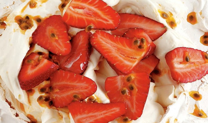 The classic pav is taken to new heights with the addition of melt-in-your-mouth coconut cream, plump summer strawberries and fragrant passionfruit pulp.
