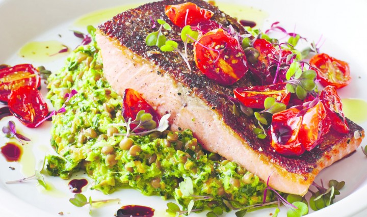This crispy-skinned salmon served on a bed of Indian-inspired lentil and potato smash with a side of slow-roasted grape tomatoes is the perfect way to warm up on chilly autumn days.